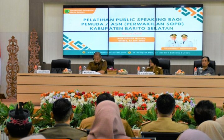 BUNTOK, BNN – Dinas Budaya Pemuda, Olahraga dan Pariwisata (Budporapar) Barito Selatan (Barsel), menggelar Pelatihan Public Speaking Bagi Pemuda dan ASN yang dibuka langsung Bupati Eddy Raya Samsuri di Aula Kantor Dinas PUPR Barsel. Selasa (22/7/25).
