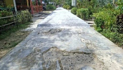 Kualitas material diduga rendah menggunakan batu pecah atau material timbunan yang tidak memenuhi spesifikasi teknik dan tebal, sambungan dan tulangan beton terindikasi dikerjakan tidak sesuai RAB.